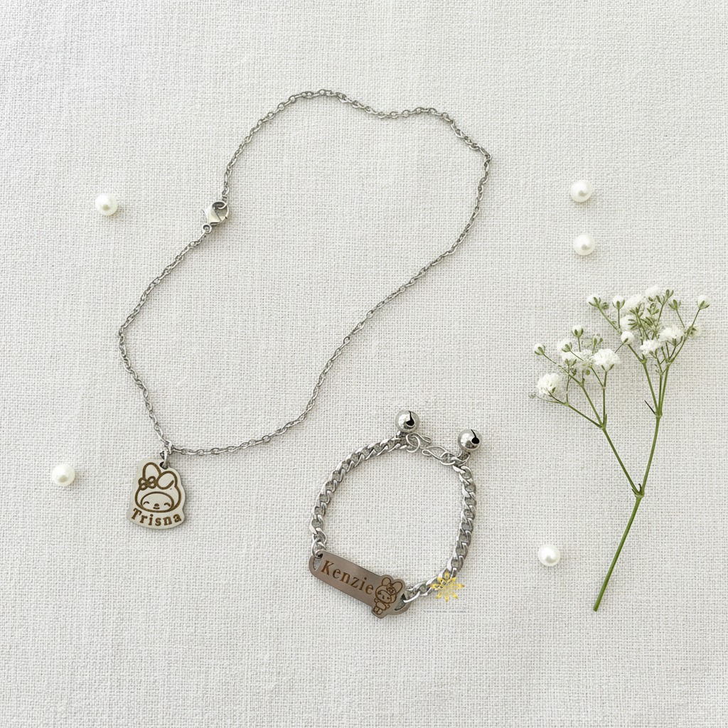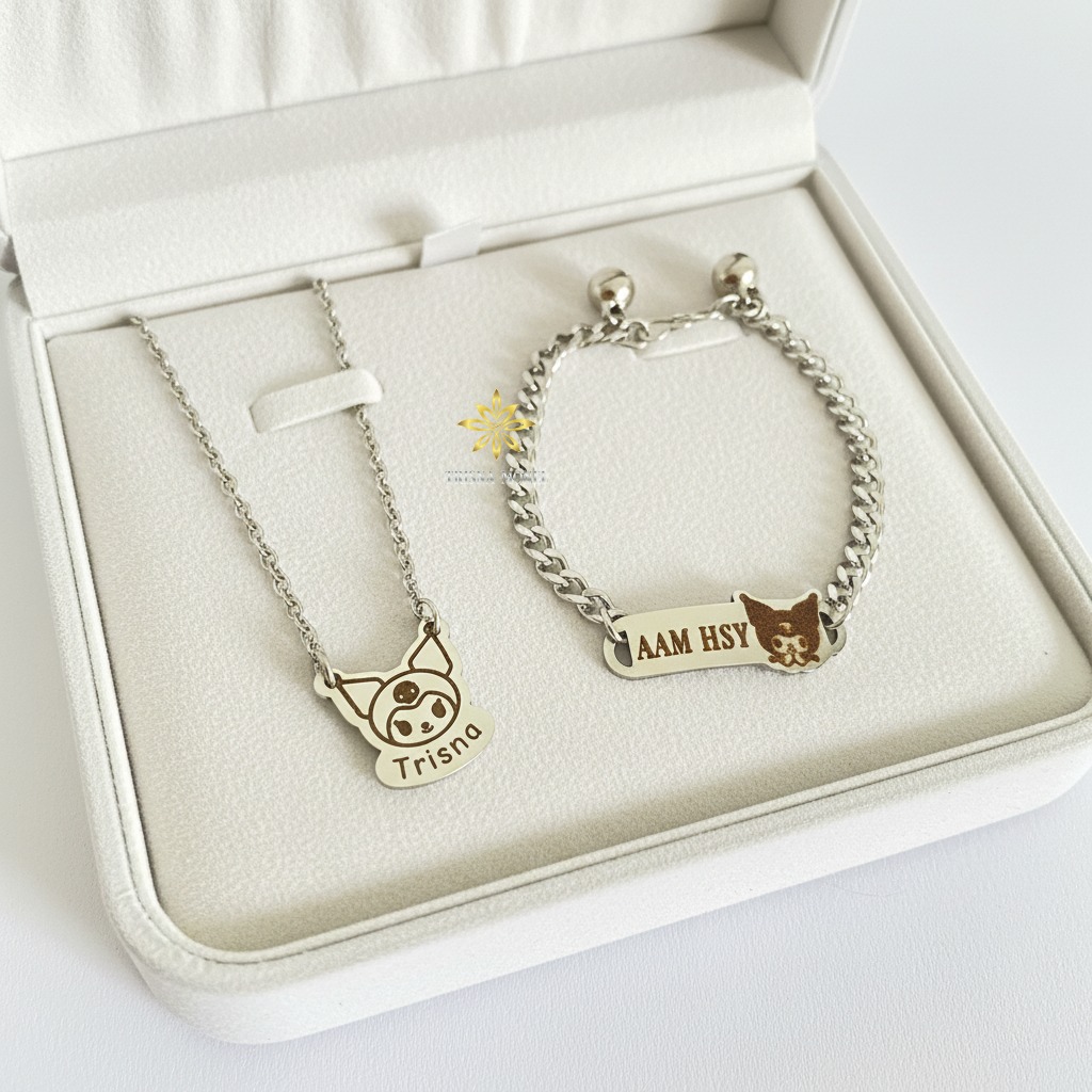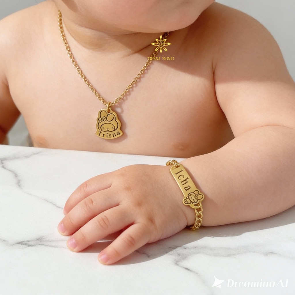 - GOLD : Dibuat dari bahan kuningan dengan ketebalan 1 ml yang dilapisi warna emas/sepuh emas dan kami kombinasi dengan rantai nori titanium ketebalan 0,5 ml.